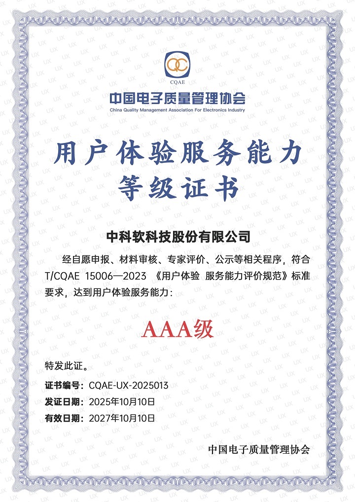 中科软科技股份有限公司于2025年10月10日,作为首批认证企业,成功荣获由中国电子质量管理协会颁发的"用户体验服务能力等级(AAA级)证书"!